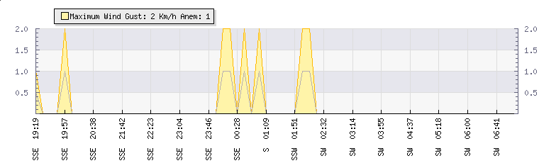 In the last few minutes the wind was South South East at an average speed of 0 kmh, reaching up to 0 kmh and a low of 0 kmh. The gust strength is0 kmh above the minimum speed |
