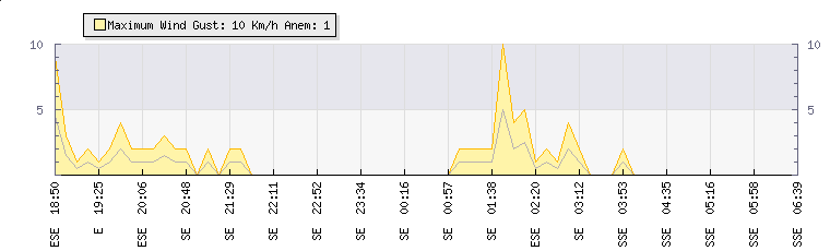In the last few minutes the wind was South South East at an average speed of 1 kmh, reaching up to 2 kmh and a low of 0 kmh. The gust strength is2 kmh above the minimum speed |