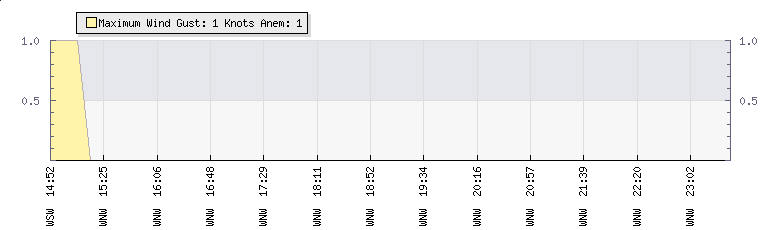 In the last few minutes the wind was West North West at an average speed of 0 knots, reaching up to 0 knots and a low of 0 knots. The gust strength is0 knots above the minimum speed |