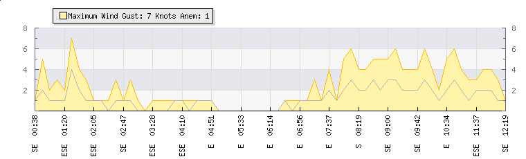 In the last few minutes the wind was Easterly at an average speed of 3 knots, reaching up to 6 knots and a low of 0 knots. The gust strength is6 knots above the minimum speed |