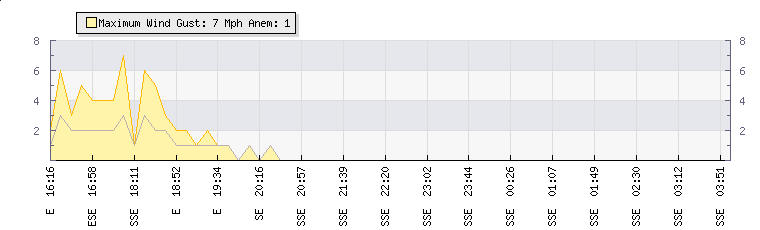 In the last few minutes the wind was South South East at an average speed of 0 mph, reaching up to 0 mph and a low of 0 mph. The gust strength is0 mph above the minimum speed |