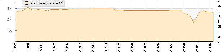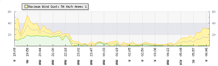 In the last few minutes the wind was Westerly at an average speed of 23 kmh, reaching up to 42 kmh and a low of 4 kmh. The gust strength is38 kmh above the minimum speed |