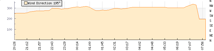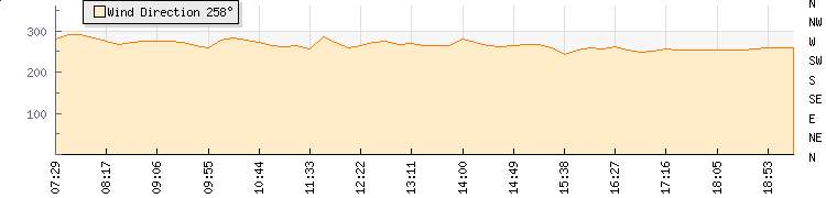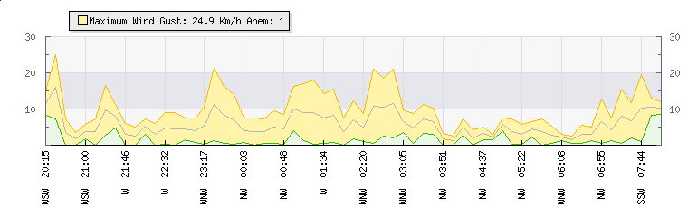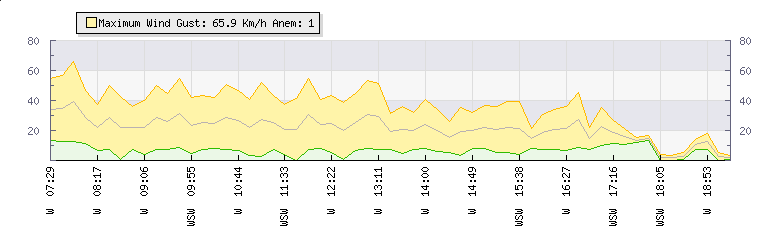 In the last few minutes the wind was West South West at an average speed of 15 kmh, reaching up to 16 kmh and a low of 13 kmh. The gust strength is3 kmh above the minimum speed |