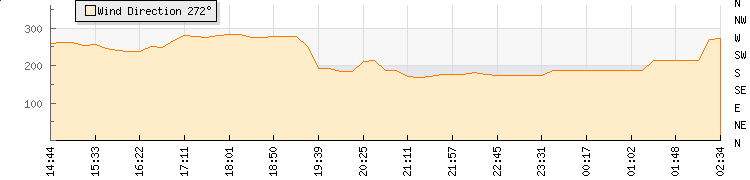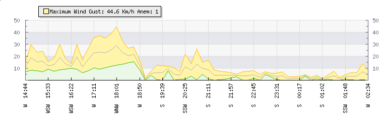 In the last few minutes the wind was Southerly at an average speed of 2 kmh, reaching up to 4 kmh and a low of 0 kmh. The gust strength is4 kmh above the minimum speed |
