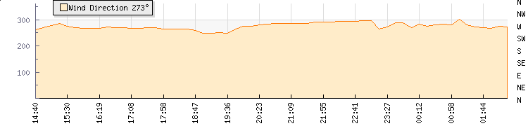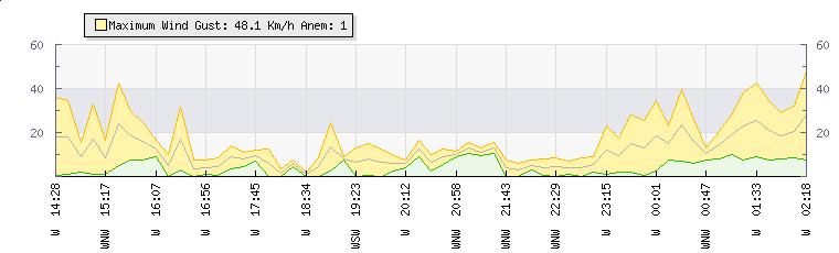 In the last few minutes the wind was Westerly at an average speed of 26 kmh, reaching up to 42 kmh and a low of 9 kmh. The gust strength is33 kmh above the minimum speed |