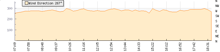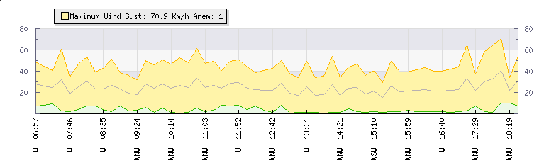 In the last few minutes the wind was Westerly at an average speed of 25 kmh, reaching up to 48 kmh and a low of 1 kmh. The gust strength is47 kmh above the minimum speed |