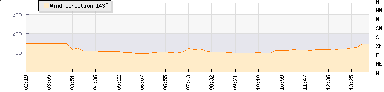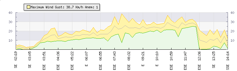 In the last few minutes the wind was East South East at an average speed of 9 kmh, reaching up to 18 kmh and a low of 0 kmh. The gust strength is18 kmh above the minimum speed |