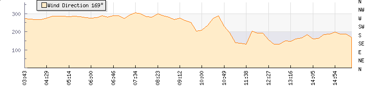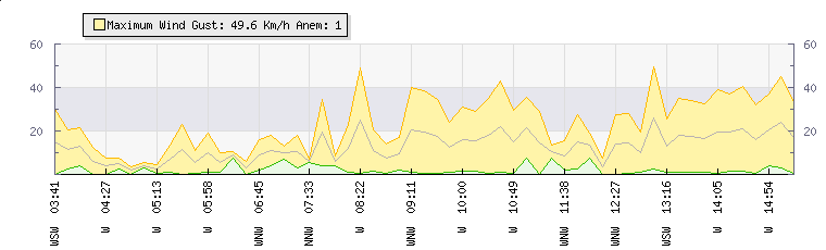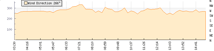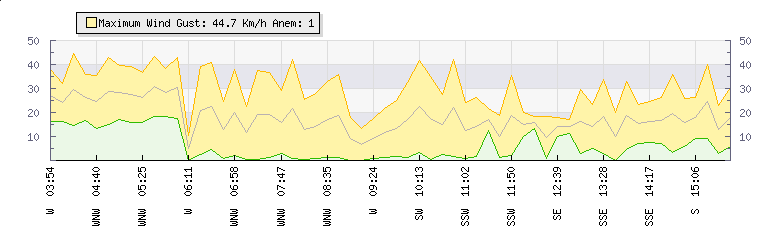 In the last few minutes the wind was Westerly at an average speed of 20 kmh, reaching up to 39 kmh and a low of 0 kmh. The gust strength is39 kmh above the minimum speed |