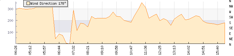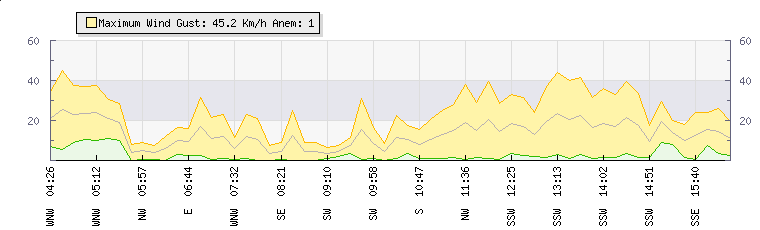 In the last few minutes the wind was South South East at an average speed of 15 kmh, reaching up to 23 kmh and a low of 7 kmh. The gust strength is16 kmh above the minimum speed |