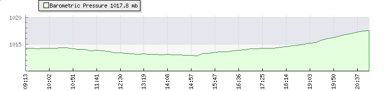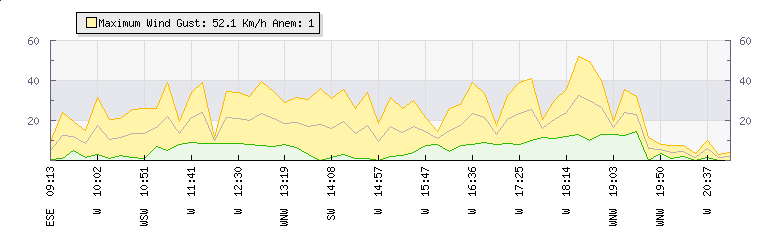 In the last few minutes the wind was West South West at an average speed of 21 kmh, reaching up to 33 kmh and a low of 9 kmh. The gust strength is24 kmh above the minimum speed |