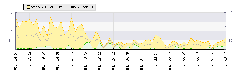 In the last few minutes the wind was Westerly at an average speed of 6 kmh, reaching up to 8 kmh and a low of 4 kmh. The gust strength is4 kmh above the minimum speed |