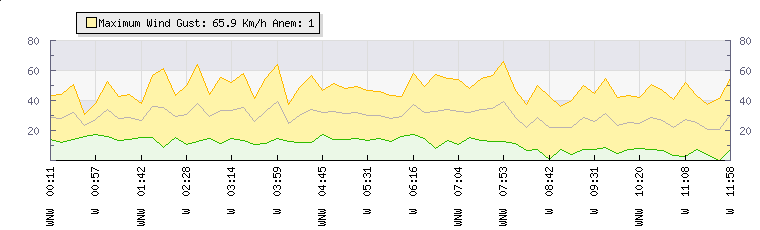 In the last few minutes the wind was Westerly at an average speed of 29 kmh, reaching up to 50 kmh and a low of 7 kmh. The gust strength is43 kmh above the minimum speed |