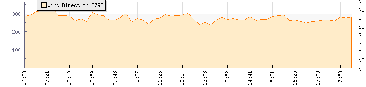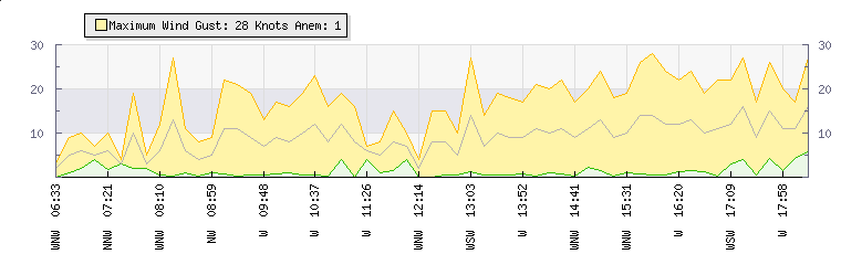 In the last few minutes the wind was Westerly at an average speed of 16 knots, reaching up to 27 knots and a low of 4 knots. The gust strength is23 knots above the minimum speed |