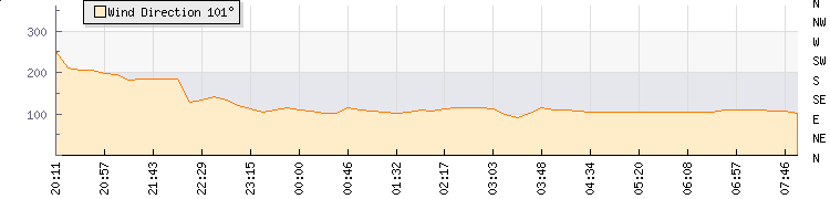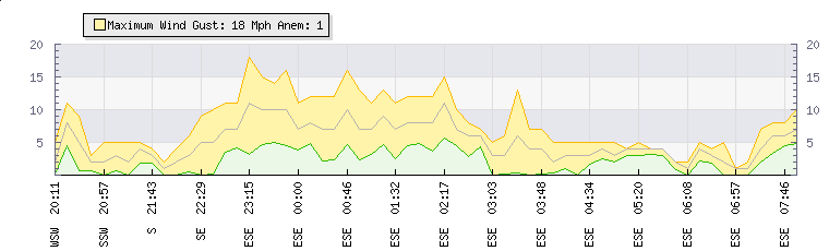 In the last few minutes the wind was East South East at an average speed of 4 mph, reaching up to 4 mph and a low of 3 mph. The gust strength is1 mph above the minimum speed |