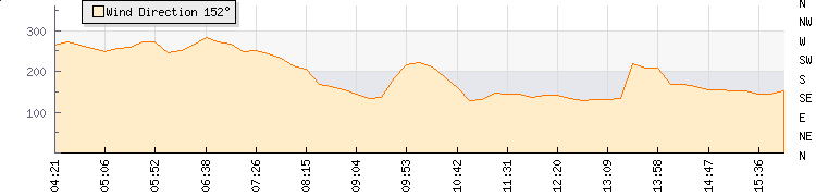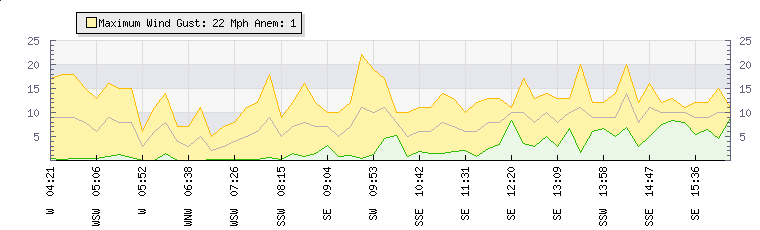 In the last few minutes the wind was South South East at an average speed of 11 mph, reaching up to 16 mph and a low of 5 mph. The gust strength is11 mph above the minimum speed |