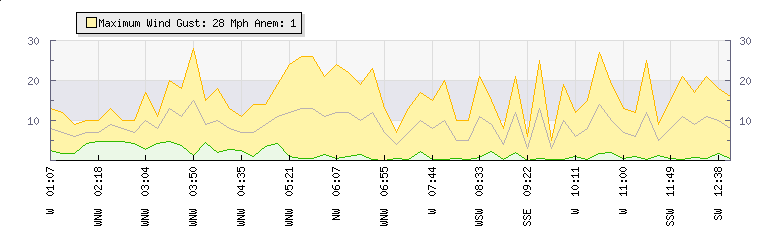 In the last few minutes the wind was Southerly at an average speed of 12 mph, reaching up to 25 mph and a low of 0 mph. The gust strength is25 mph above the minimum speed |