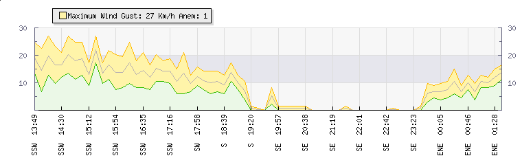 In the last few minutes the wind was South South West at an average speed of 15 kmh, reaching up to 20 kmh and a low of 11 kmh. The gust strength is9 kmh above the minimum speed |