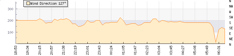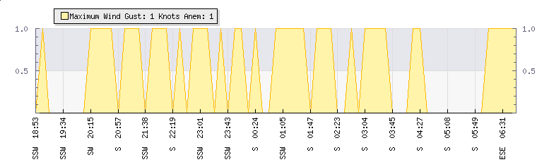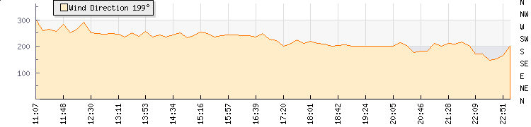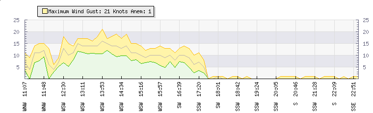In the last few minutes the wind was West South West at an average speed of 14 knots, reaching up to 19 knots and a low of 10 knots. The gust strength is9 knots above the minimum speed |