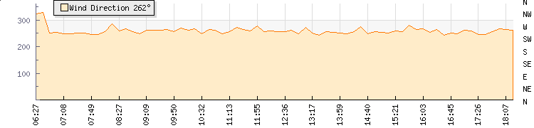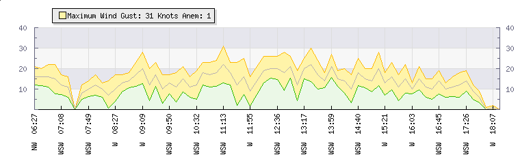 In the last few minutes the wind was Westerly at an average speed of 11 knots, reaching up to 16 knots and a low of 6 knots. The gust strength is10 knots above the minimum speed |