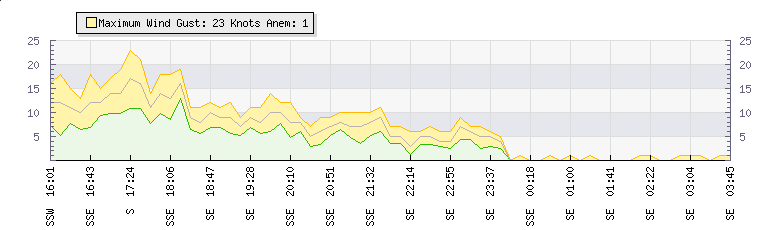 In the last few minutes the wind was South South East at an average speed of 0 knots, reaching up to 0 knots and a low of 0 knots. The gust strength is0 knots above the minimum speed |