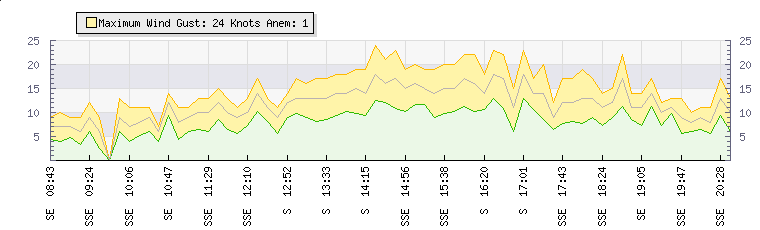 In the last few minutes the wind was South South East at an average speed of 17 knots, reaching up to 22 knots and a low of 11 knots. The gust strength is11 knots above the minimum speed |