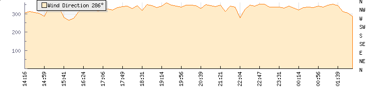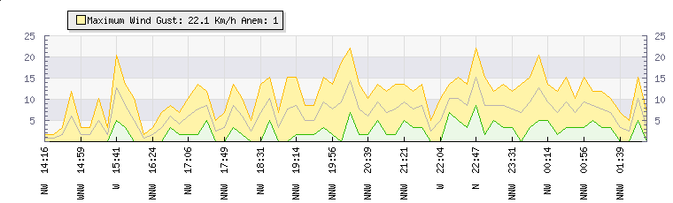 In the last few minutes the wind was Northerly at an average speed of 5 kmh, reaching up to 10 kmh and a low of 0 kmh. The gust strength is10 kmh above the minimum speed |