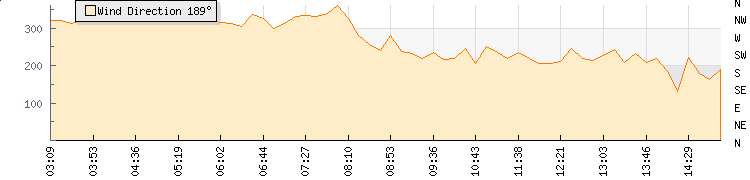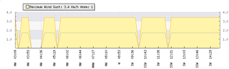 In the last few minutes the wind was South Westerly at an average speed of 2 kmh, reaching up to 3 kmh and a low of 0 kmh. The gust strength is3 kmh above the minimum speed |