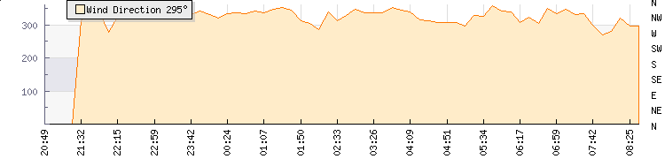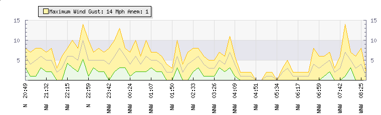 In the last few minutes the wind was North North West at an average speed of 3 mph, reaching up to 5 mph and a low of 0 mph. The gust strength is5 mph above the minimum speed |