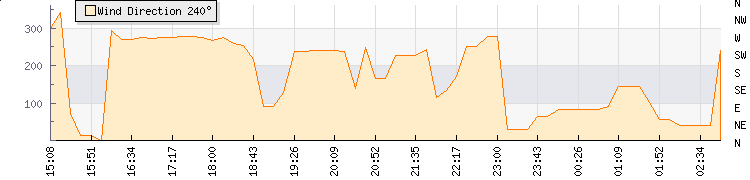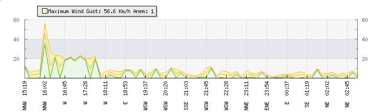 In the last few minutes the wind was East South East at an average speed of 9 kmh, reaching up to 10 kmh and a low of 8 kmh. The gust strength is2 kmh above the minimum speed |