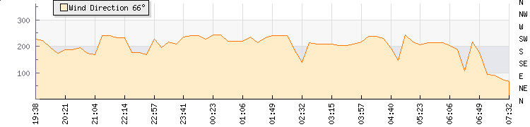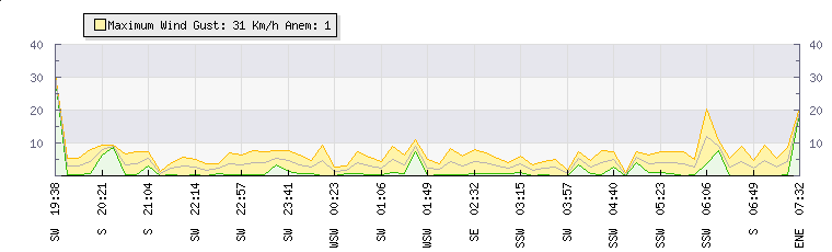In the last few minutes the wind was South South West at an average speed of 6 kmh, reaching up to 8 kmh and a low of 3 kmh. The gust strength is5 kmh above the minimum speed |