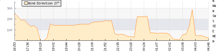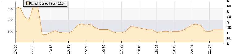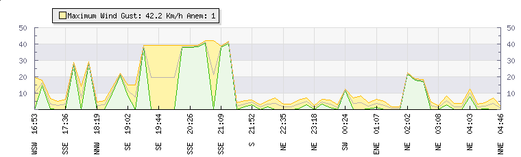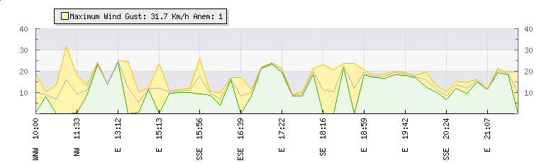 In the last few minutes the wind was South South East at an average speed of 14 kmh, reaching up to 16 kmh and a low of 12 kmh. The gust strength is4 kmh above the minimum speed |