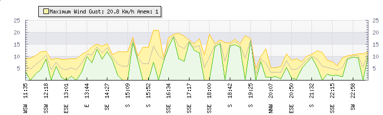In the last few minutes the wind was Southerly at an average speed of 6 kmh, reaching up to 12 kmh and a low of 0 kmh. The gust strength is12 kmh above the minimum speed |