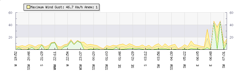 In the last few minutes the wind was Easterly at an average speed of 5 kmh, reaching up to 8 kmh and a low of 1 kmh. The gust strength is7 kmh above the minimum speed |