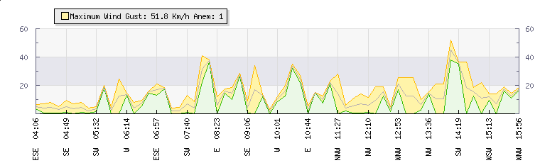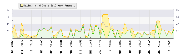 In the last few minutes the wind was North Easterly at an average speed of 30 kmh, reaching up to 30 kmh and a low of 29 kmh. The gust strength is1 kmh above the minimum speed |
