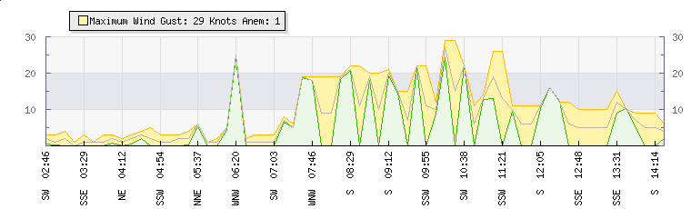 | Last Update: | 2025-10-31 08:07:52 |  | Weather Summary: | In the last few minutes the wind was West North West at an average speed of 9 knots, reaching up to 19 knots and a low of 0 knots.  The gust strength is19 knots above the minimum speed |  |