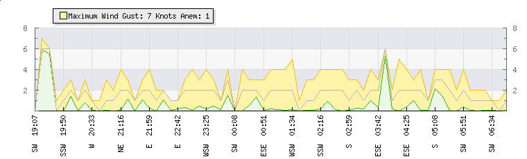 In the last few minutes the wind was East North East at an average speed of 3 knots, reaching up to 4 knots and a low of 1 knots. The gust strength is3 knots above the minimum speed |