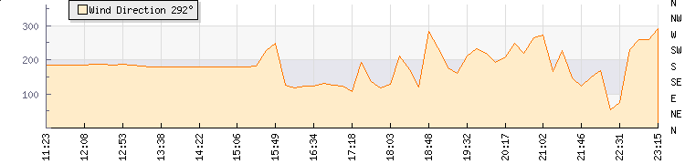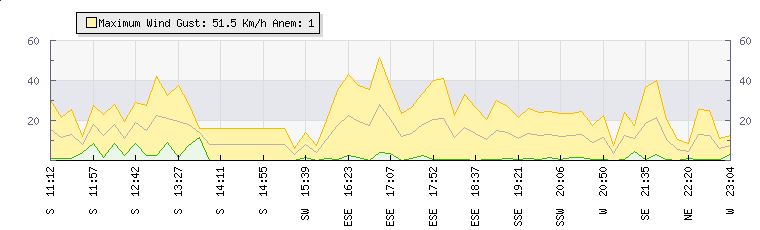 In the last few minutes the wind was South Westerly at an average speed of 9 kmh, reaching up to 17 kmh and a low of 0 kmh. The gust strength is17 kmh above the minimum speed |