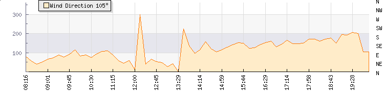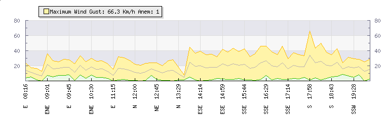 In the last few minutes the wind was South South East at an average speed of 26 kmh, reaching up to 50 kmh and a low of 1 kmh. The gust strength is49 kmh above the minimum speed |