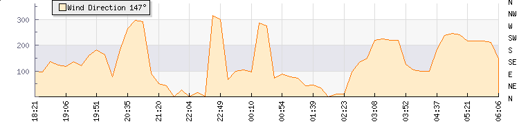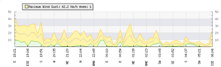 In the last few minutes the wind was South Westerly at an average speed of 2 kmh, reaching up to 3 kmh and a low of 0 kmh. The gust strength is3 kmh above the minimum speed |