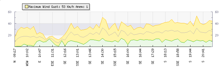 In the last few minutes the wind was South Easterly at an average speed of 25 kmh, reaching up to 39 kmh and a low of 11 kmh. The gust strength is28 kmh above the minimum speed |