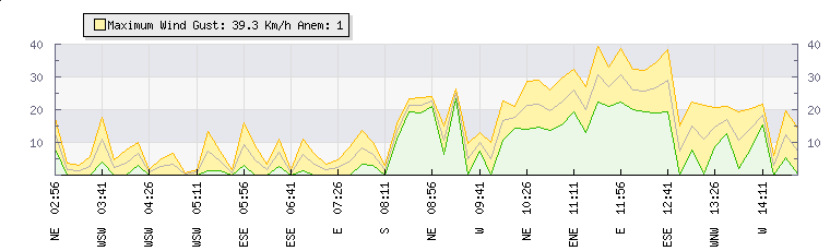 In the last few minutes the wind was North North West at an average speed of 11 kmh, reaching up to 21 kmh and a low of 0 kmh. The gust strength is21 kmh above the minimum speed |
