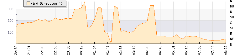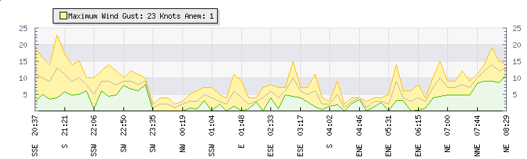 In the last few minutes the wind was South Easterly at an average speed of 3 knots, reaching up to 6 knots and a low of 1 knots. The gust strength is5 knots above the minimum speed |
