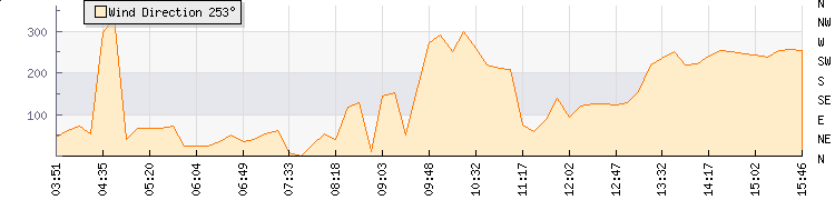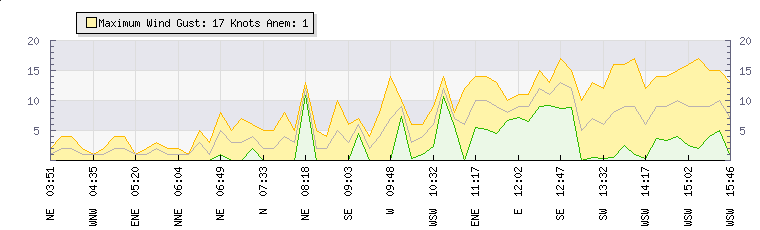 In the last few minutes the wind was South Westerly at an average speed of 9 knots, reaching up to 16 knots and a low of 2 knots. The gust strength is14 knots above the minimum speed |