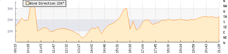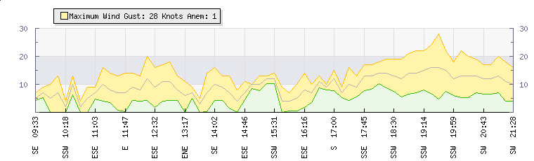 In the last few minutes the wind was South South West at an average speed of 12 knots, reaching up to 18 knots and a low of 6 knots. The gust strength is12 knots above the minimum speed |