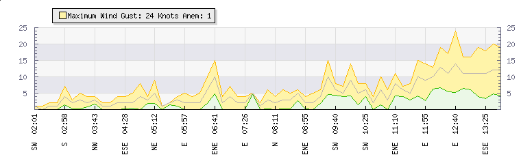 In the last few minutes the wind was North North West at an average speed of 3 knots, reaching up to 5 knots and a low of 0 knots. The gust strength is5 knots above the minimum speed |