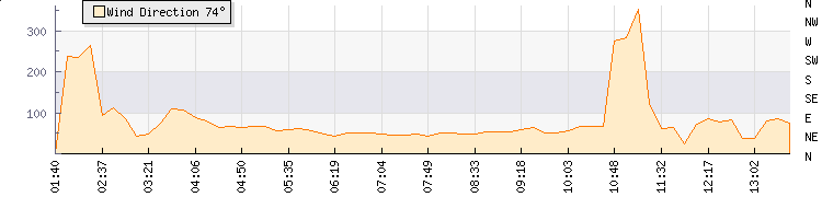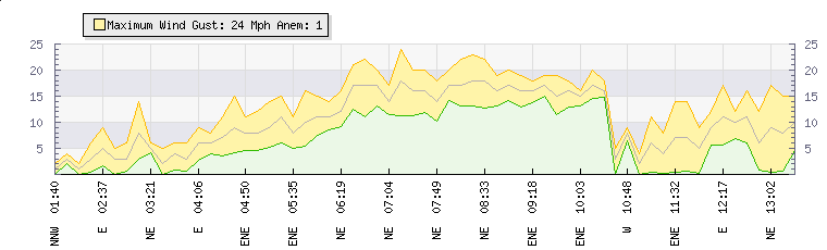 In the last few minutes the wind was East North East at an average speed of 3 mph, reaching up to 5 mph and a low of 0 mph. The gust strength is5 mph above the minimum speed |