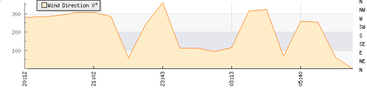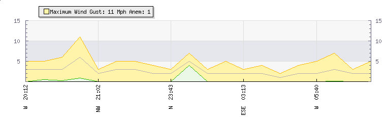In the last few minutes the wind was West South West at an average speed of 3 mph, reaching up to 7 mph and a low of 0 mph. The gust strength is7 mph above the minimum speed |