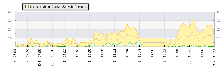 In the last few minutes the wind was West South West at an average speed of 2 mph, reaching up to 5 mph and a low of 0 mph. The gust strength is5 mph above the minimum speed |