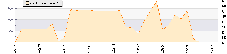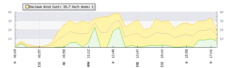 In the last few minutes the wind was South South East at an average speed of 16 kmh, reaching up to 30 kmh and a low of 2 kmh. The gust strength is28 kmh above the minimum speed |