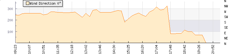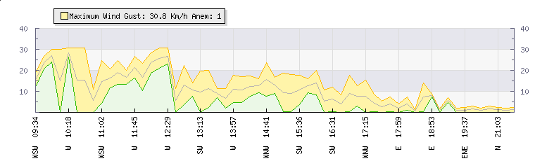 In the last few minutes the wind was South Westerly at an average speed of 11 kmh, reaching up to 18 kmh and a low of 4 kmh. The gust strength is14 kmh above the minimum speed |